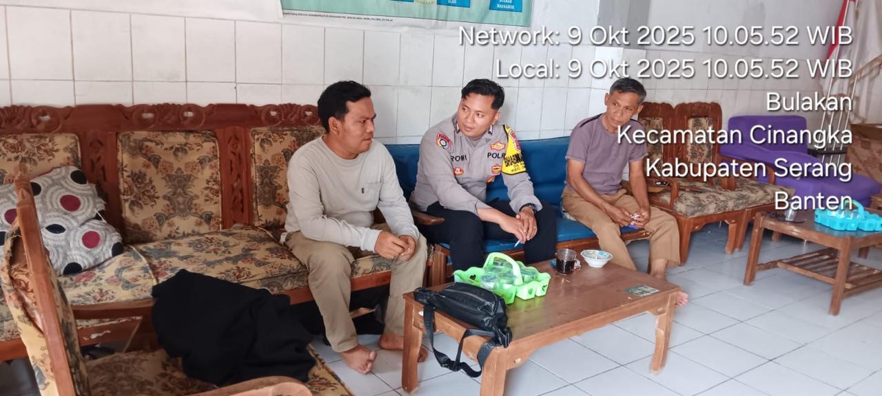 *CILEGON* dalam Rangka Mengantisipasi Gktm di wilayah Personil Bhabinkamtibmas Cinangka melakukan patroli Dialogis dengan Kepala Desa dan warga dan Menanyakan situasi Kamtibmas di wilayah dalam Rangka Menjaga Harkamtibmas di Desa Binaannya Kecamatan Cinangka Kab. Serang. Kamis (09/10/2025).