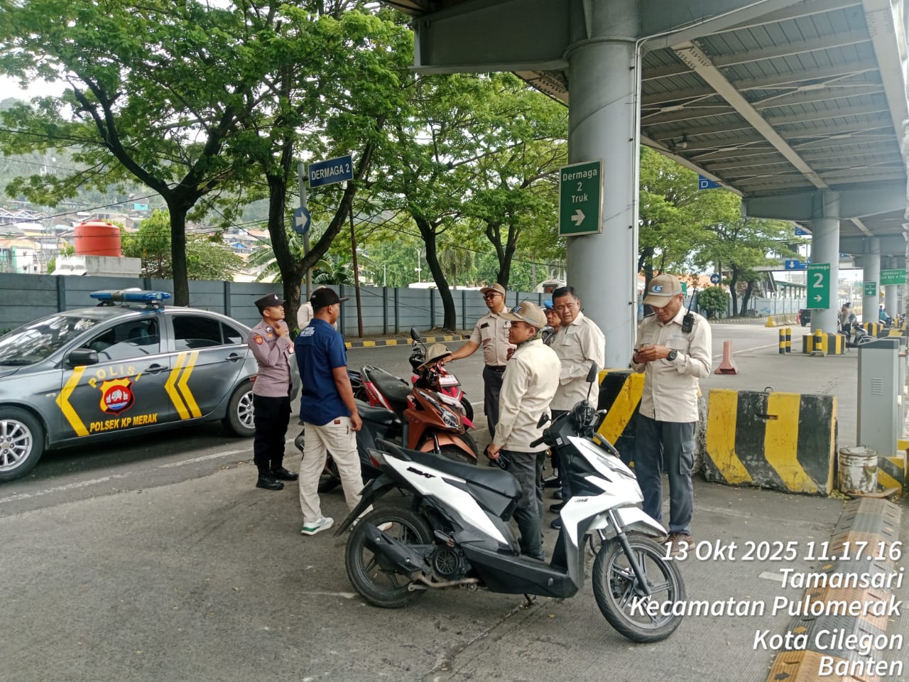 Cilegon - Personel Polsek Kskp Merak Polres Cilegon Polda Banten melaksanakan sambang dan patroli kawasan pelabuhan merak dalam rangka menjaga Harkamtibmas di Kawasan Pelabuhan Merak, Senin (13/10/2025).