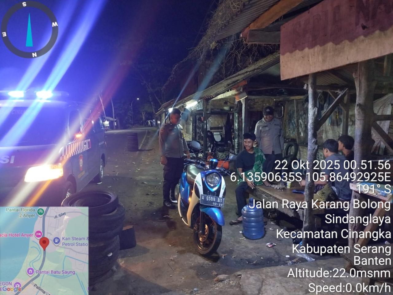 *Cilegon* – Dalam Rangka Pencegahan Kejahatan Jalanan dan Memelihara situasi keamanan dan menjaga serta memberikan rasa aman dan nyaman di masyarakat,Salah satu upaya untuk mewujudkan hal tersebut sebagaimana yang dilakukan oleh Personil Polsek Cinangka Polres Cilegon Polda Banten melaksanakan giat patroli blue light malam hari hingga menjelang pagi, Rabu (22/10/2025).