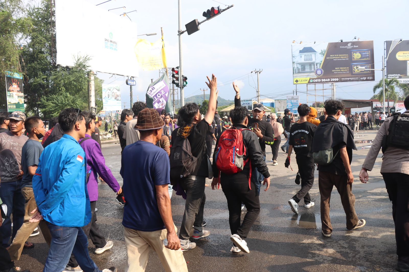 massa sempat memblokade akses jalan di sekitar lokasi aksi. Kasat Intel Polres Cilegon bersama Kasat Intel Polresta Serang Kota kemudian melakukan penggalangan terhadap massa dan salah satu tokoh aksi, Muksinin, untuk membuka jalan kembali demi menjaga kelancaran arus lalu lintas dan menghindari gangguan yang lebih luas kepada masyarakat.