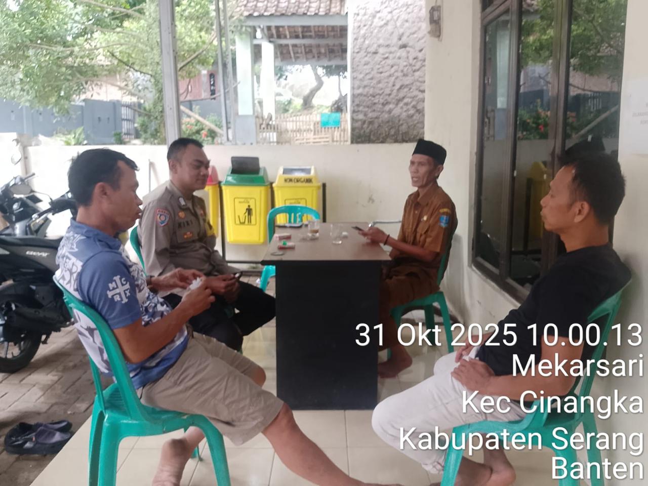 *CILEGON* dalam Rangka Mengantisipasi Gktm di wilayah Personil Bhabinkamtibmas Cinangka melakukan patroli Dialogis dengan Kepala Desa dan warga dan Menanyakan situasi Kamtibmas di wilayah dalam Rangka Menjaga Harkamtibmas di Desa Binaannya Kecamatan Cinangka Kab. Serang. Jumat.(31/10/2025).