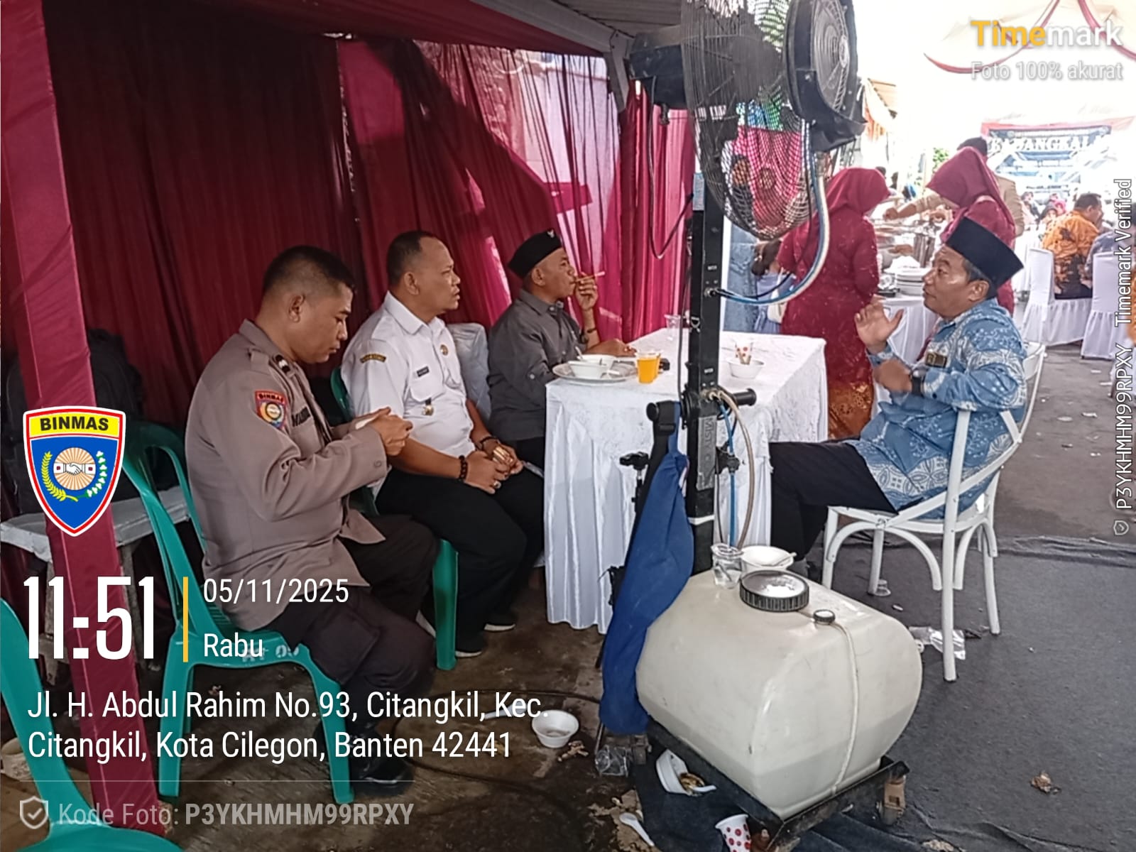 Cilegon - Bhabinkamtibmas Polsek Ciwandan Polres Cilegon Polda Banten melaksanakan Kegiatan Kondangan/Undangan ini bertujuan untuk memastikan acara berlangsung dengan aman dan tertib, serta memberikan rasa aman kepada warga yang menghadiri resepsi pernikahan tersebut, Rabu (05/11/2025).