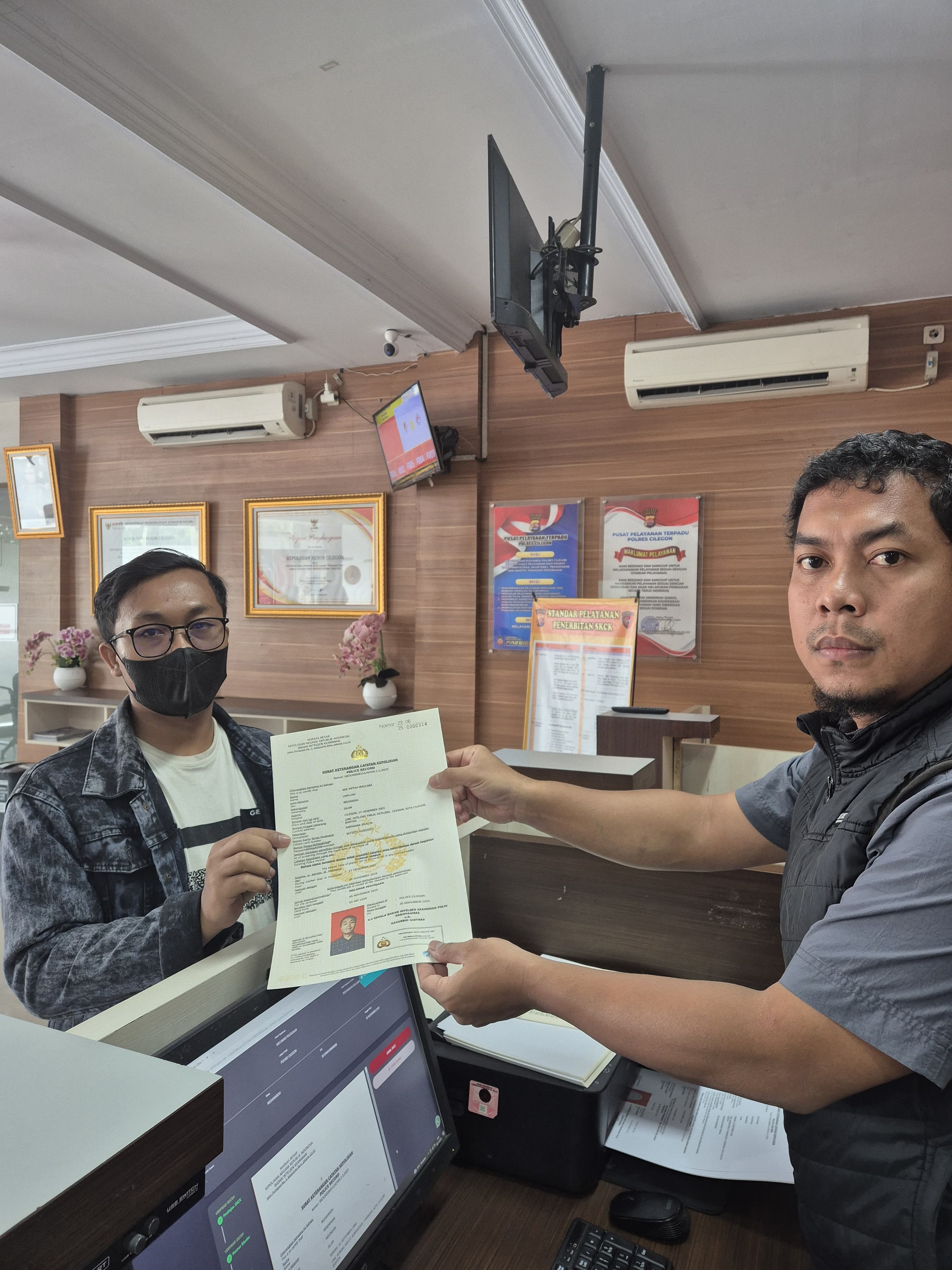 CILEGON - Testimoni penerbitan Surat Keterangan Catatan Kepolisian (SKCK) berbasis online. Sistem itu mulai diberlakukan awal November 2025, seluruh proses pendaftaran SKCK di wilayah hukum Polres Cilegon wajib dilakukan melalui Aplikasi Super App Polri versi terbaru (SKCK Full Online).