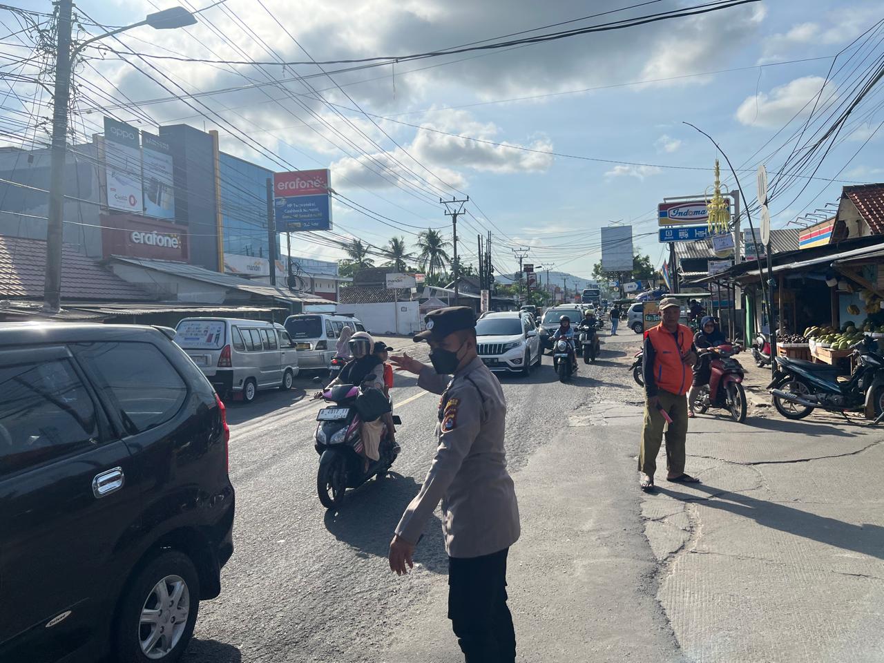 Anggota Polres Cilegon melaksanakan Pengaturan Arus Lalin atau Gatur Strong Point di arah jalur Wisata Pantai Anyer Banten.