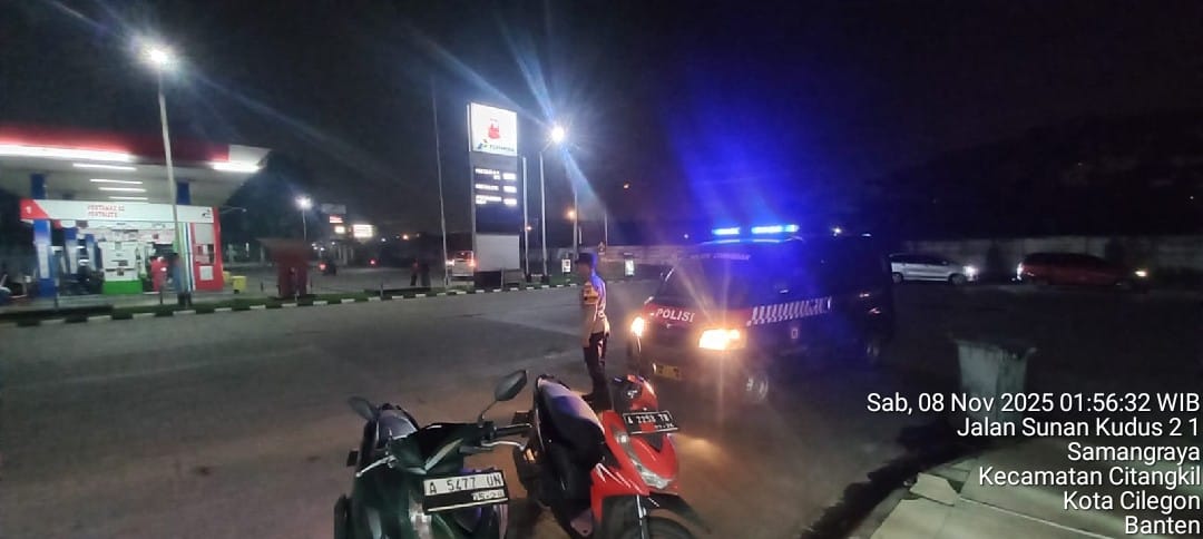 Cilegon - Personil Polsek Ciwandan Polres Cilegon Polda Banten Dalam Pelaksanaan Kegiatan Patroli dengan menyalakan lampu rotator berwarna biru di Daerah Hukum Polsek Ciwandan Polres Cilegon Polda Banten dari malam hingga dini hari, dalam rangka menciptakan situasi aman dan kondusif, Sabtu (08/11/2025).