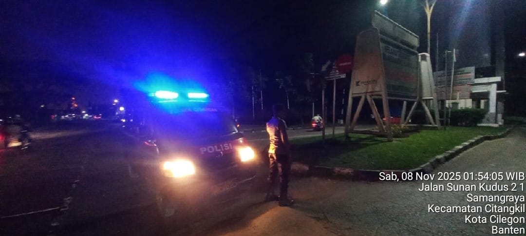 Cilegon - Personil Polsek Ciwandan Polres Cilegon Polda Banten Dalam Pelaksanaan Kegiatan Patroli dengan menyalakan lampu rotator berwarna biru di Daerah Hukum Polsek Ciwandan Polres Cilegon Polda Banten dari malam hingga dini hari, dalam rangka menciptakan situasi aman dan kondusif, Sabtu (08/11/2025).