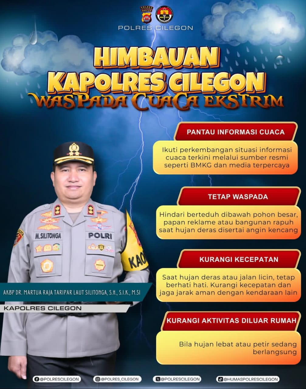 Kapolres Cilegon, AKBP Dr. Martua Raja TAripar Laut Silitonga, S.H., S.I.K., M.Si., memberikan himbauan waspada kepada masyarakat Cilegon terkait cuaca ekstrem yang sedang melanda wilayah tersebut. Dalam himbauannya, Kapolres mengimbau masyarakat untuk selalu waspada dan berhati-hati dalam menghadapi cuaca ekstrem, serta mematuhi instruksi dari pihak berwenang. Masyarakat juga diimbau untuk memastikan keamanan rumah dan lingkungan sekitar, serta menghindari aktivitas di luar ruangan jika tidak diperlukan.