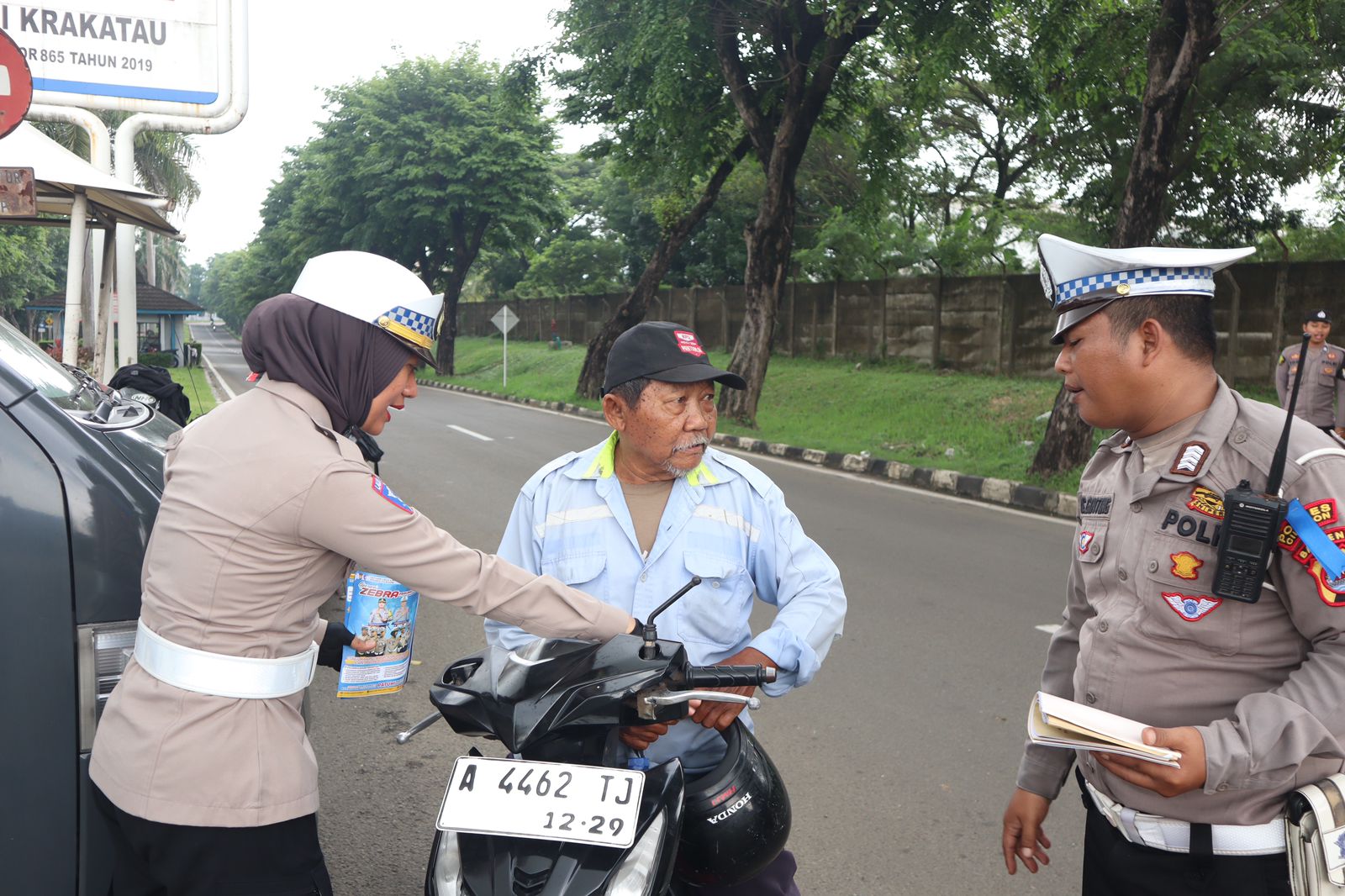 Petugas kemudian membagikan leaflet dan menempelkan stiker imbauan keselamatan kepada pengguna jalan yang melintas. Edukasi langsung juga diberikan, terutama kepada para pengendara roda dua yang belum memahami pentingnya penggunaan helm berstandar SNI dan mematuhi peraturan dasar berkendara.