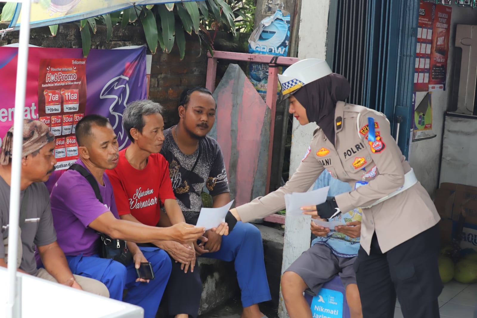 Petugas kemudian membagikan leaflet dan menempelkan stiker imbauan keselamatan kepada pengguna jalan yang melintas. Edukasi langsung juga diberikan, terutama kepada para pengendara roda dua yang belum memahami pentingnya penggunaan helm berstandar SNI dan mematuhi peraturan dasar berkendara.