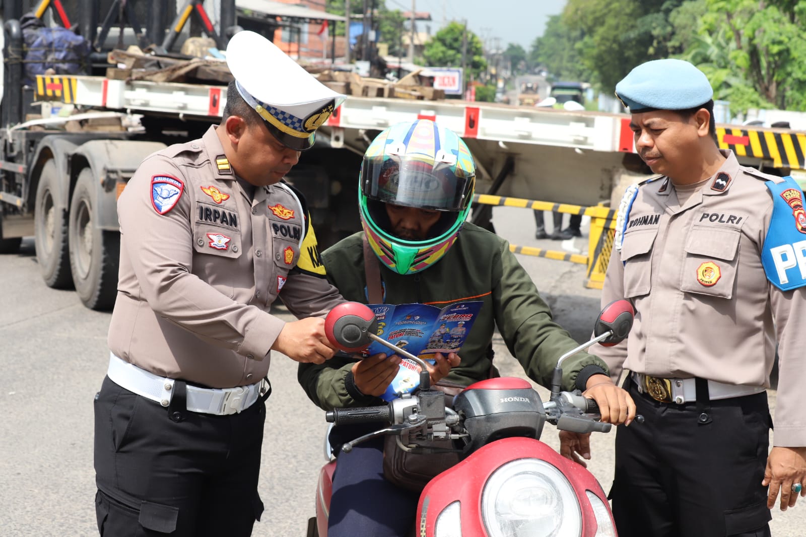 Petugas kemudian membagikan leaflet dan menempelkan stiker imbauan keselamatan kepada pengguna jalan yang melintas. Edukasi langsung juga diberikan, terutama kepada para pengendara roda dua yang belum memahami pentingnya penggunaan helm berstandar SNI dan mematuhi peraturan dasar berkendara.