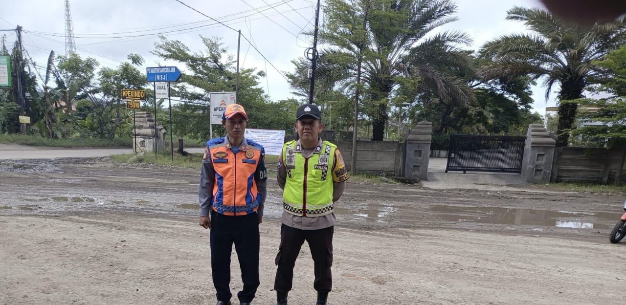 Laksanakan Strong Poin Di Sore Hari, Bhabinkamtibmas dan Dishub Laksanakan Giat Pengaturan Lalin Di Jalan Raya PT MSJ Bojonegara