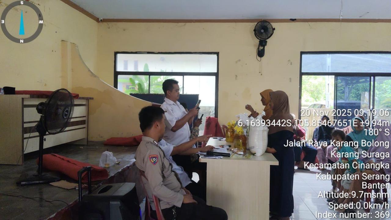 *Polres Cilegon* - Bhabinkamtibmas Desa Karagsuraga Polsek Cinangka Polres Cilegon Polda Banten Bripka Oki Berikan Pengamanan, Monitoring dan Kawal Pelaksanaan Penyaluran Bantuan Pangan Non Tunai Dari Badan Pangan Nasional Di Aula kantor Desa Karangsuraga kecamatan Cinangka Kab Serang, Kamis (20/11/2025).