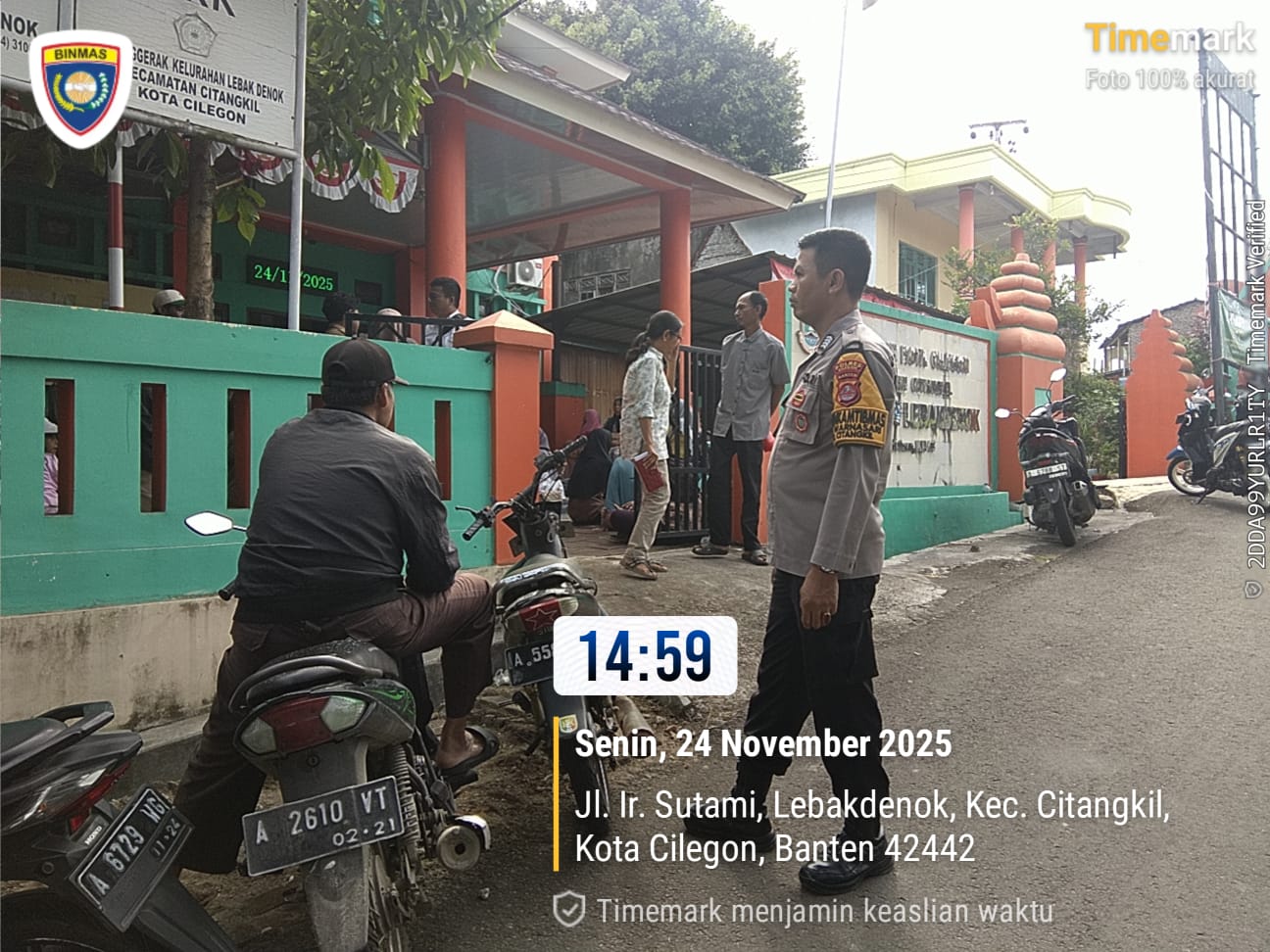 Cilegon - Bhabinkamtibmas Kelurahan Lebak Denok, AIPTU YUDI SETIAWAN, melaksanakan pengamanan dan monitoring bantuan langsung tunai dari Kementerian Sosial RI di Kantor Kelurahan Lebak Denok, Kecamatan Citangkil, Kota Cilegon, Senin (24/11/2025).