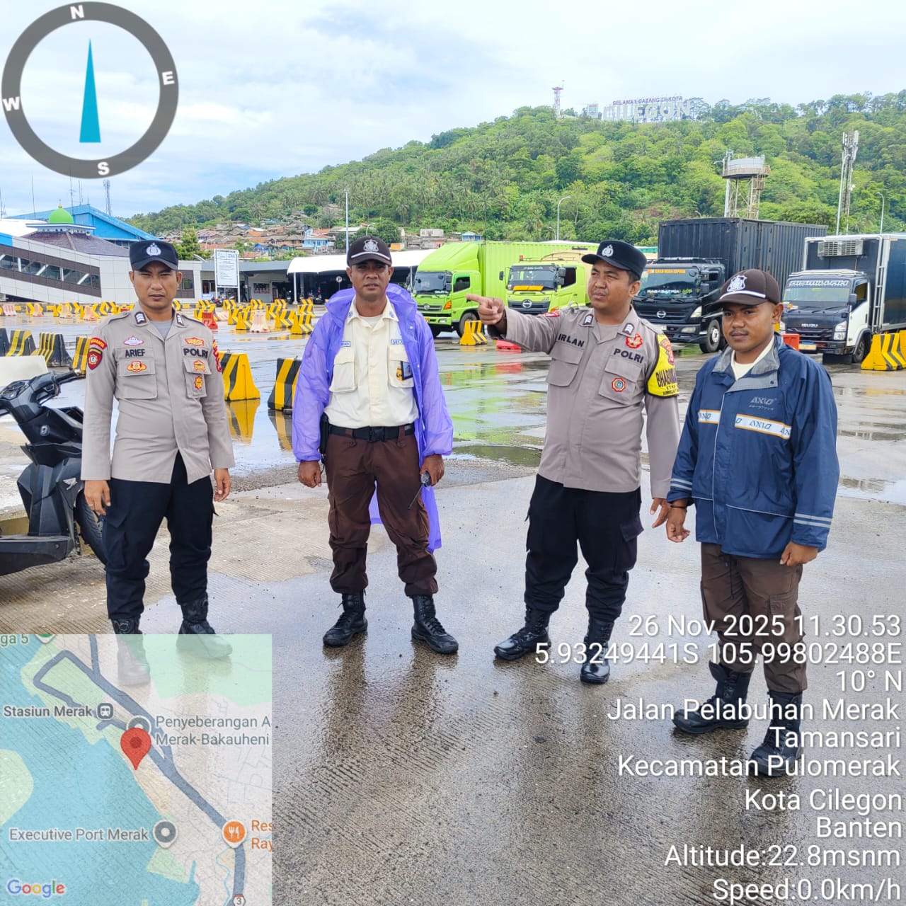 Cilegon - Personel Polsek Kskp Merak Polres Cilegon Polda Banten melaksanakan sambang dan patroli kawasan pelabuhan merak dalam rangka menjaga Harkamtibmas di Kawasan Pelabuhan Merak, Rabu (26/11/2025).