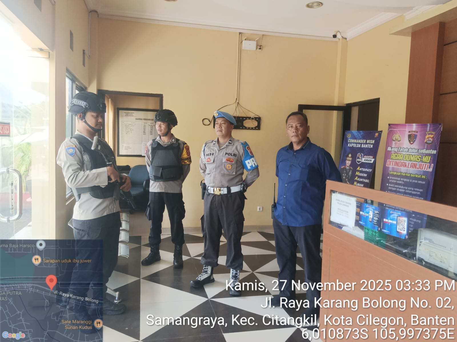 Kapolres Cilegon Polda Banten AKBP Dr. Martua Raja Taripar Laut Silitonga yang diwakili oleh Kapolsek Ciwandan Polres Cilegon Polda Banten KOMPOL Andi Suherman menerangkan bahwa sebagai langkah dalam mencegah timbulnya potensi gangguan dari luar terhadap keamanan kantor maupun keselamatan personel piket jaga, selalu memerintahkan kepada personel yang melaksanakan piket jaga Mako agar sewaktu-waktu menggelar kegiatan Sispam Mako.