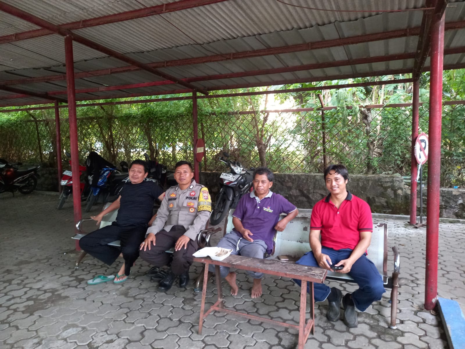 Bhabinkamtibmas wilayah SMK YPWKS, Bripka Agustoni, melakukan kegiatan penyapa petugas keamanan sekolah sambil menyampaikan himbauan penting terkait ketertiban dan keamanan masyarakat (kamtibmas)