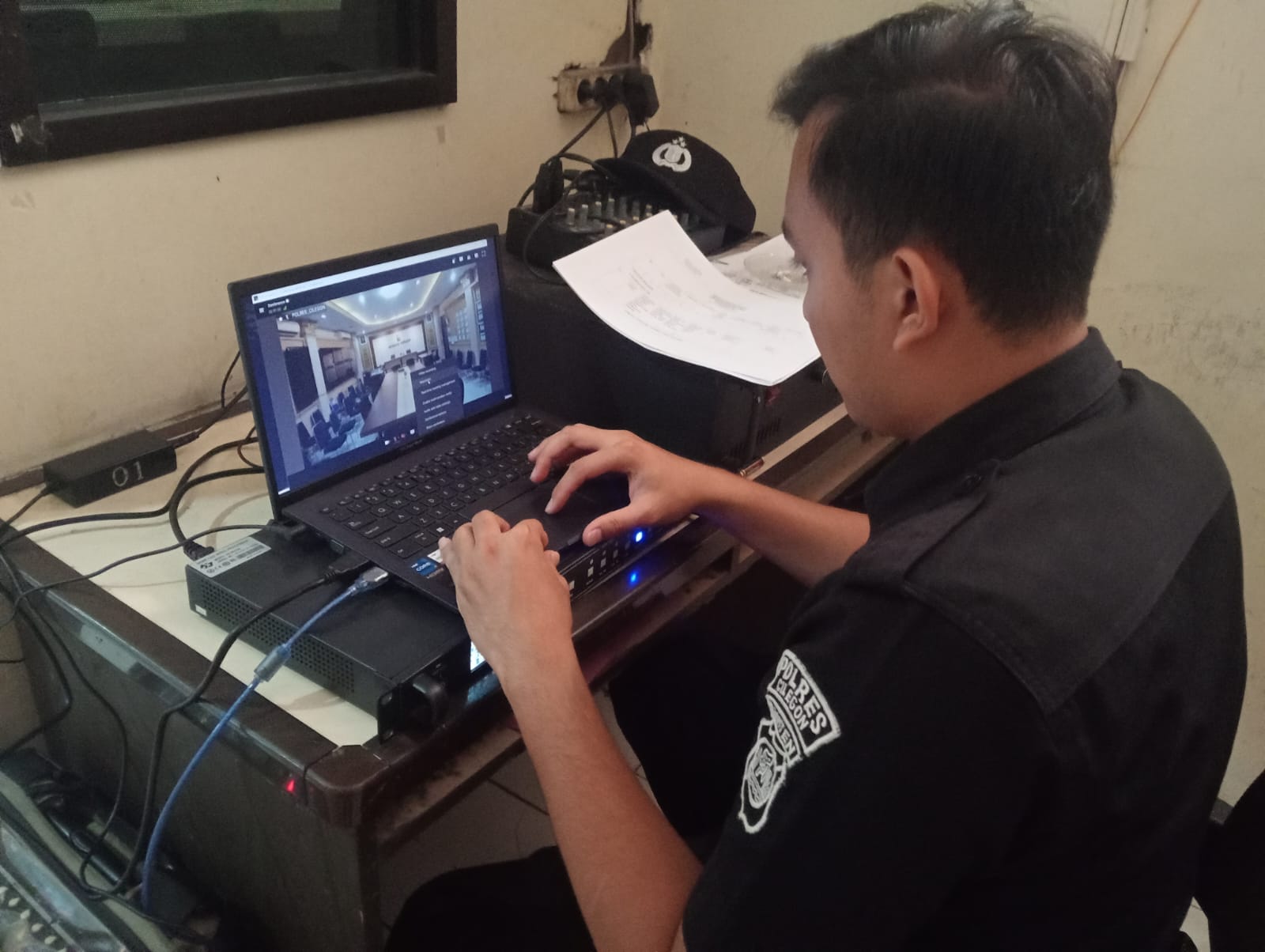 Anggota Tik Polres Cilegon Menyiapkan Sarana dan Prasarana Untuk Kegiatan Zoom meeting Dalam pelaksanaan kegiatan zoom meeting tersebut anggota TIK Polres Cilegon yang bertanggung jawab untuk menyiapkan peralatan zoom. Selain itu agar di tidak ada gangguan jaringan sebelum pelaksanaan anggota TIK melakukan pemeriksaan terhadap sarana dan prasarana tersebut . Satu jam sebelum kegiatan zoom meeting itu dimulai. Kapolres Cilegon AKBP. DR. MARTUA RAJA TARIPAR LAUT SILITONGA. melalui Kasi TIK IPTU Lukman menyampaikan bahwa “untuk menunjang kelancaran penyampaian informasi anggota TIk Polres Cilegon selalu memeriksa sarana dan prasarana tersebut, sebelum maupun pada saat pelaksanaan akan selalu di monitor”