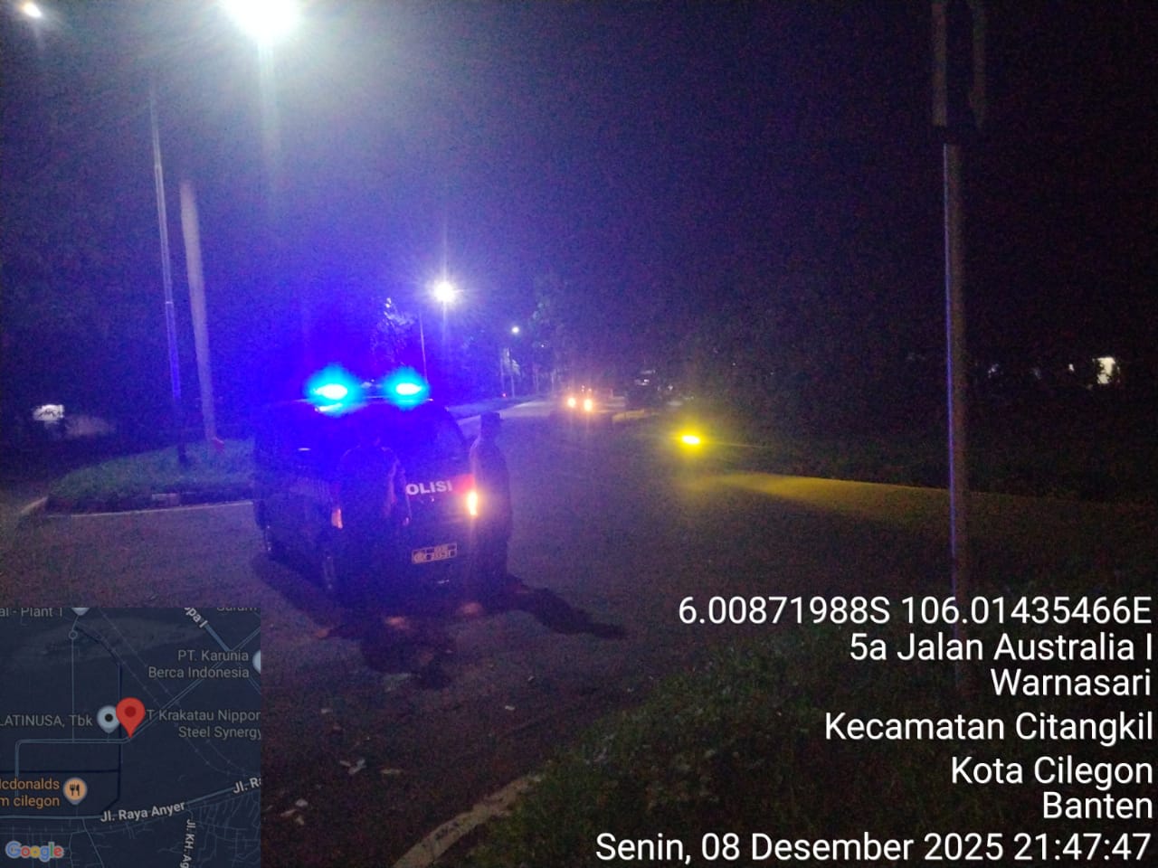 Cilegon - Personil Polsek Ciwandan Polres Cilegon Polda Banten Dalam Pelaksanaan Kegiatan Patroli dengan menyalakan lampu rotator berwarna biru di Daerah Hukum Polsek Ciwandan Polres Cilegon Polda Banten dari malam hingga dini hari, dalam rangka menciptakan situasi aman dan kondusif, Senin (08/12/2025).