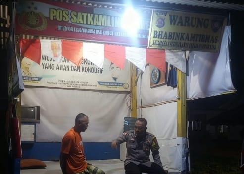 Bhabinkamtibmas Kelurahan Purwakarta Bripka Nugraha dari Polsek Purwakarta melakukan kunjungan ke Pos Ronda di Link Kaligandu, Kelurahan Purwakarta, Kecamatan Purwakarta, Kota Cilegon