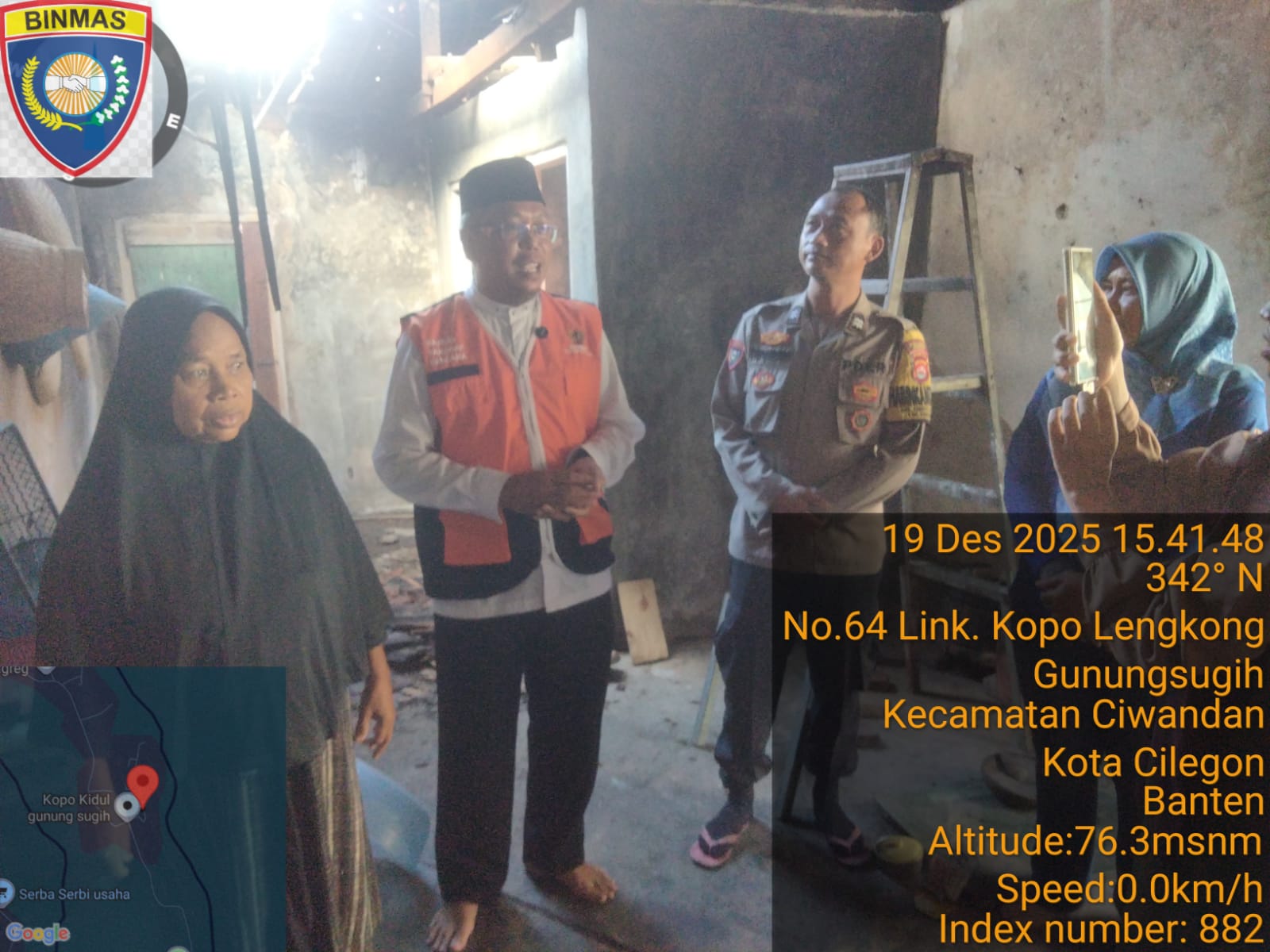 Cilegon - Bhabinkamtibmas Kelurahan Gunung Sugih AIPTU Tri Widodo, mendampingi BAZNAS Kota Cilegon memberikan bantuan kepada Ibu Junariyah, warga Link Kopo Landoh, Kel. Gunung Sugih, Ciwandan, Jum'at (19/12/2025).