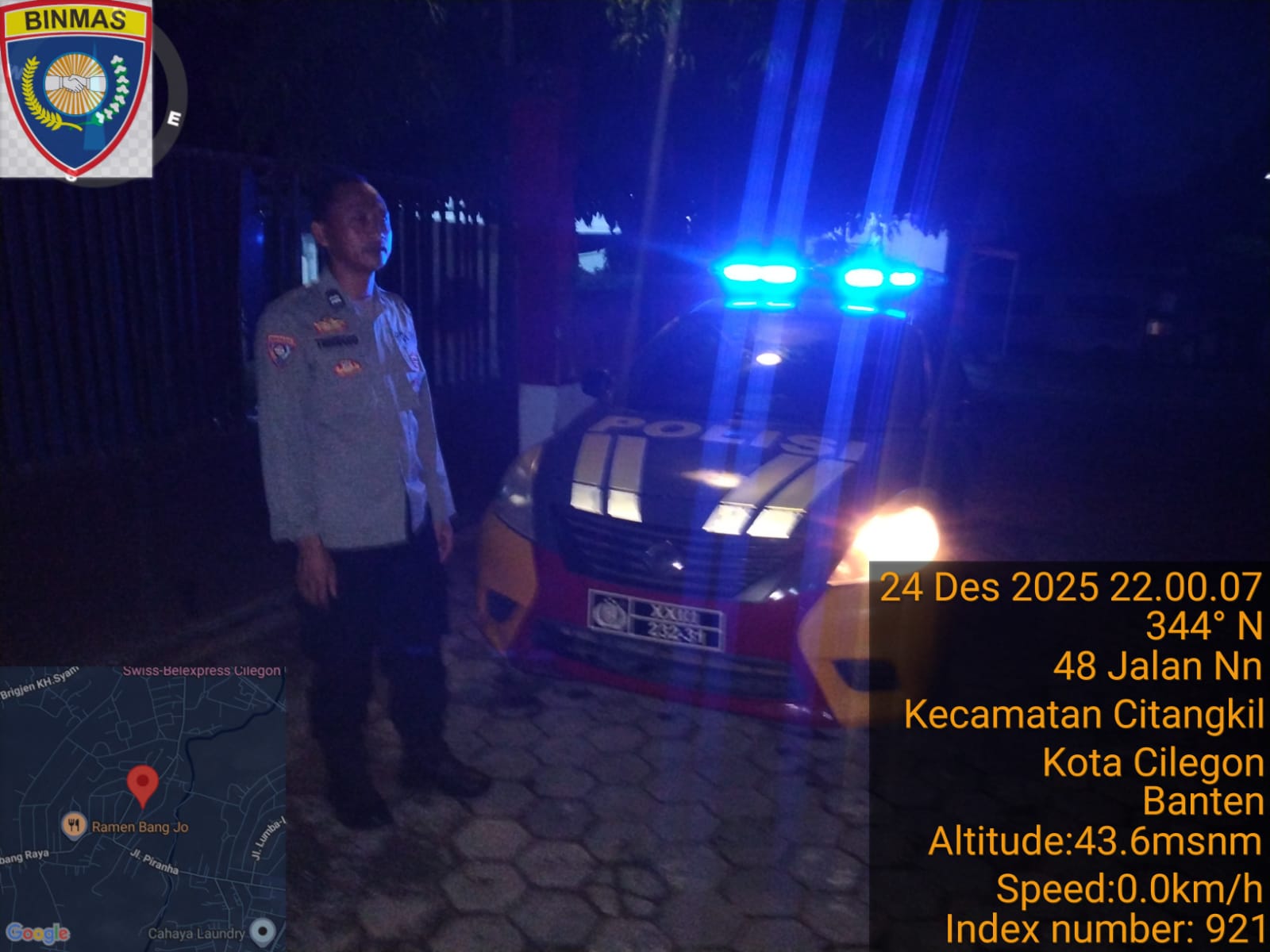 Cilegon - Personil Polsek Ciwandan Polres Cilegon Polda Banten Dalam Pelaksanaan Kegiatan Patroli dengan menyalakan lampu rotator berwarna biru di Daerah Hukum Polsek Ciwandan Polres Cilegon Polda Banten dari malam hingga dini hari, dalam rangka menciptakan situasi aman dan kondusif, Kamis (25/12/2025).