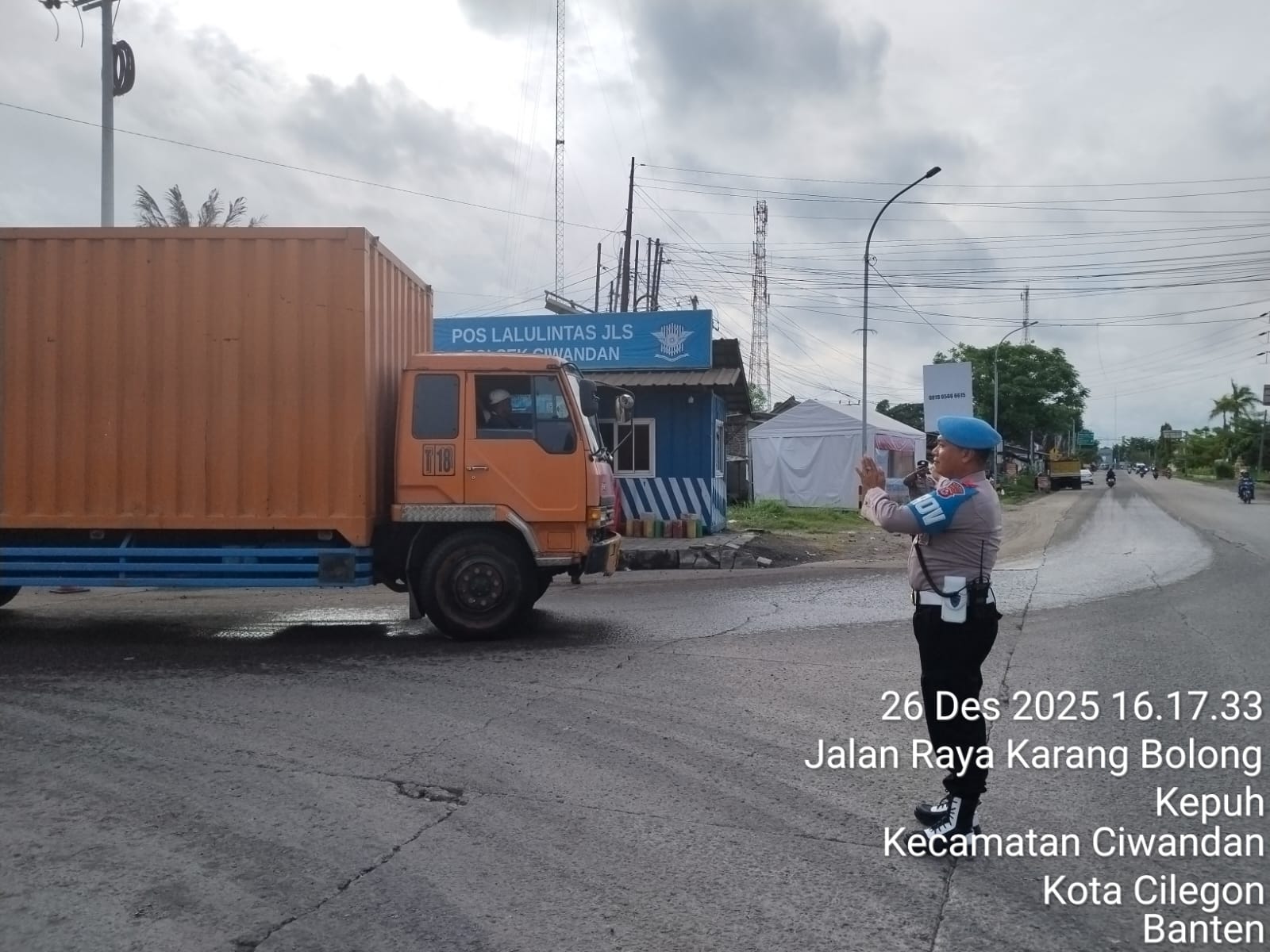 Cilegon - Guna Menciptakan kelancaran arus Mudik Natal tahun 2025 Dan Tahun Baru 2026 yang menuju Pelabuhan Pelindo Dan jalur wisata yang ada di daerah hukum Polsek Ciwandan Polres Cilegon Polda Banten,Pospam 5 Ciwandan berlakukan rekayasa Lalu lintas, Jum'at (26/12/2025).
