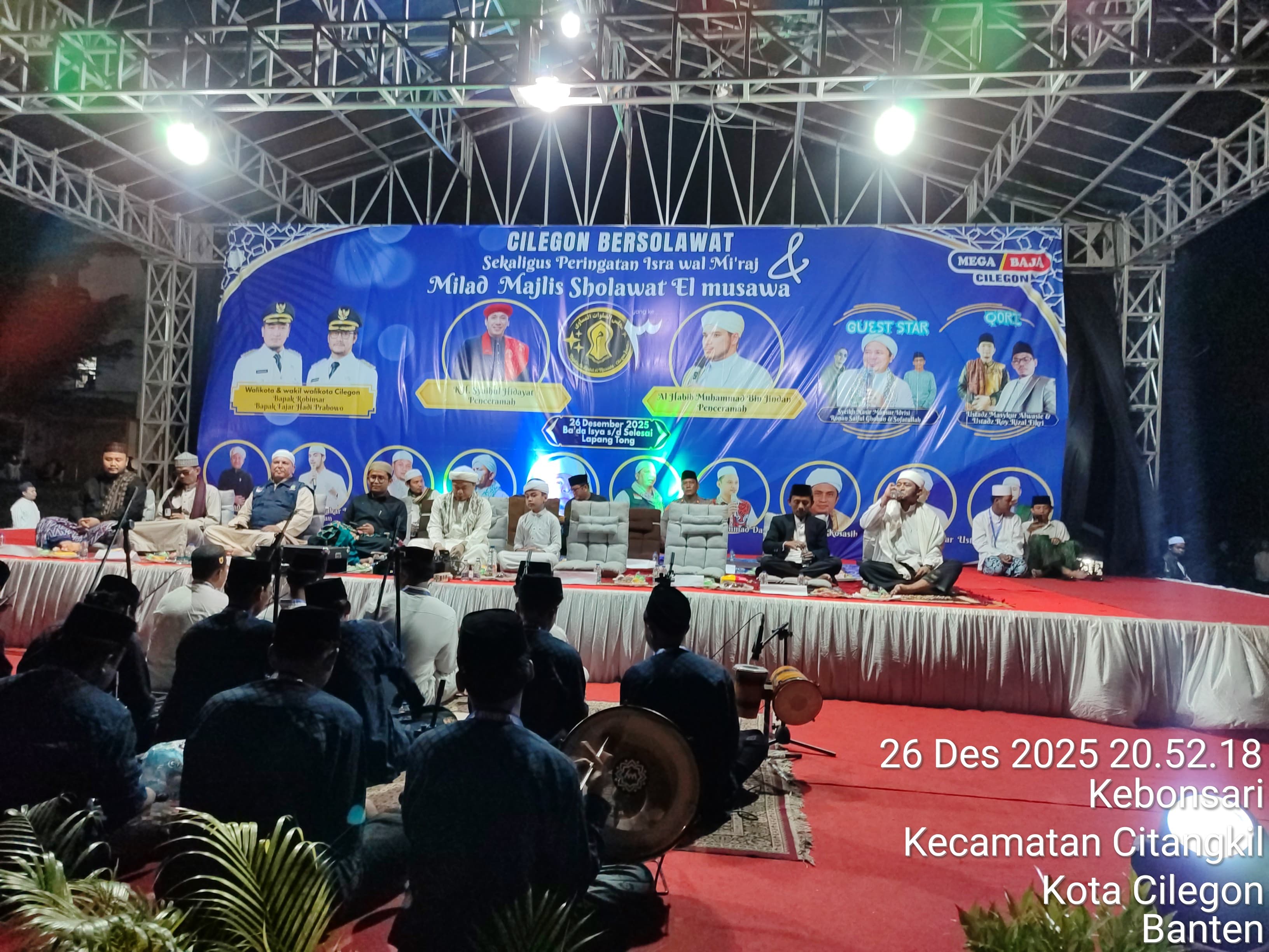 Cilegon - Polres Cilegon melalui Polsek Ciwandan melaksanakan monitoring kegiatan Gema Cilegon Bersholawat dalam rangka Majlis Sholawat El-Musawa ke-3 dan peringatan Isro Mi'raj Nabi Muhammad SAW di Lapangan Tong Alamat, Kebon Sari, Citangkil, Minggu (28/12/2025).