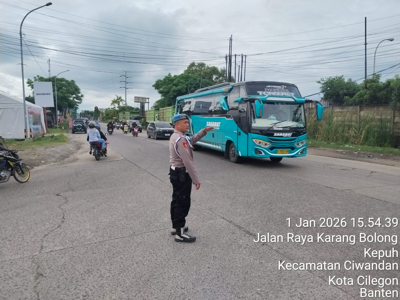 Cilegon - Guna Menciptakan kelancaran arus Mudik Natal tahun 2025 Dan Tahun Baru 2026 yang menuju Pelabuhan Pelindo Dan jalur wisata yang ada di daerah hukum Polsek Ciwandan Polres Cilegon Polda Banten,Pospam 5 Ciwandan berlakukan rekayasa Lalu lintas, Kamis (01/01/2026).