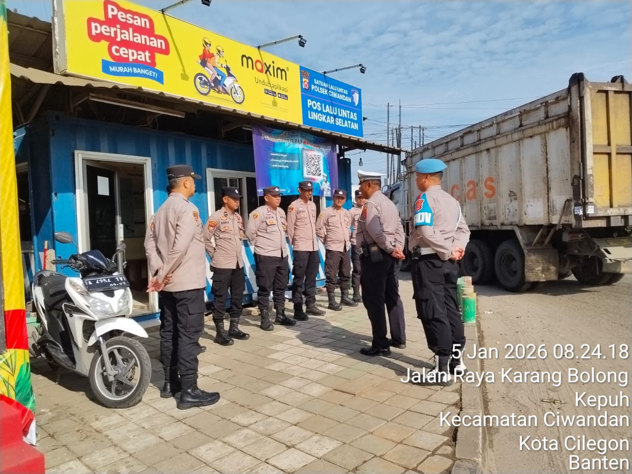 Kapolres Cilegon Polda Banten AKBP Dr. Martua Raja Taripar Laut Silitonga yang di wakili Kapolsek Ciwandan Polres Cilegon Polda Banten Kompol Andi Suherman mengatakan, "Guna terciptanya kelancaran arus Libur Natal Dan tahun Baru 2025-2026, Pospam 5 Ciwandan merekayasa arus lalu lintas yang akan menuju Pelabuhan Pelindo Banten.
