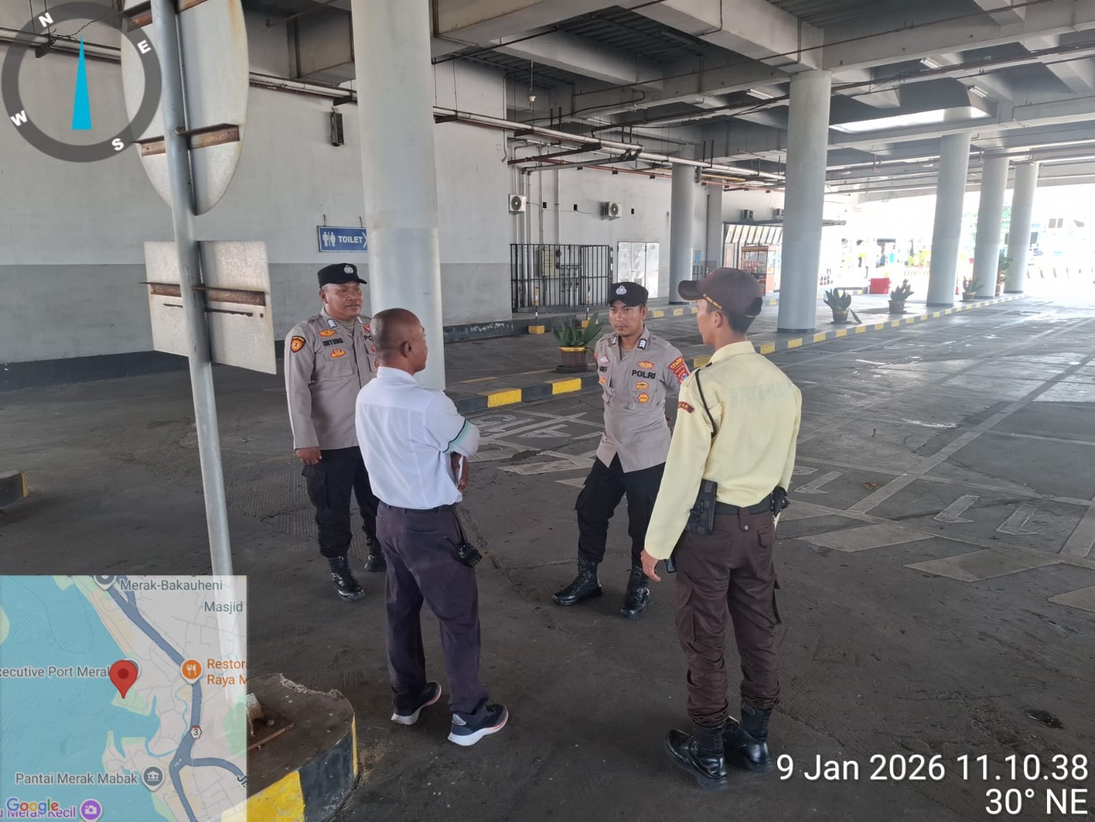 \Cilegon - Personel Polsek Kskp Merak Polres Cilegon Polda Banten melaksanakan sambang dan patroli kawasan pelabuhan merak dalam rangka menjaga Harkamtibmas di Kawasan Pelabuhan Merak, Jumat (09/01/2026).