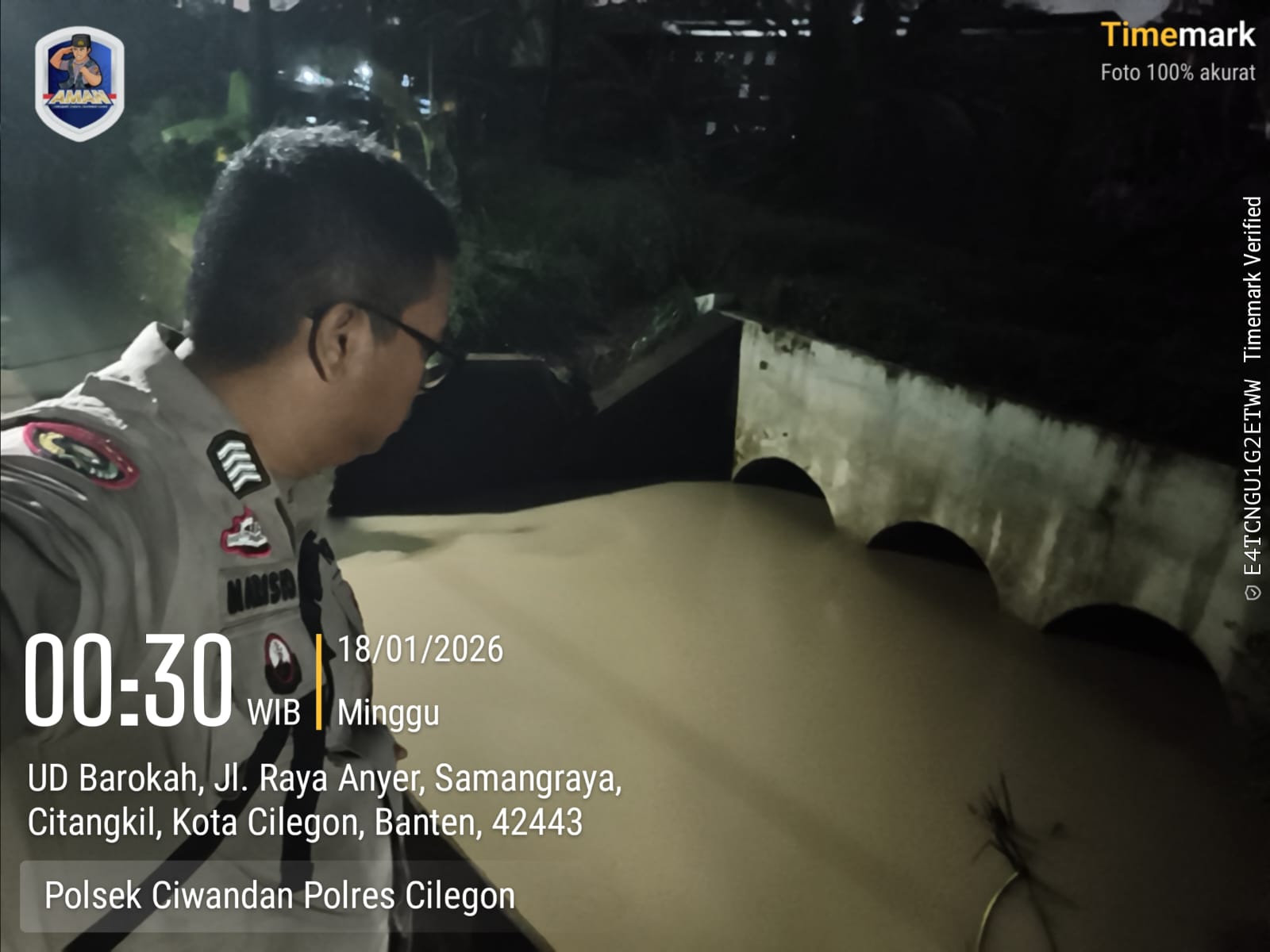 Cilegon - Dalam rangka antisipasi bencana alam personil Polsek ciwandan mengecek debit air di beberapa titik aliran sungai salah satunya yaitu kalimuk RT 005 RW 006 Kelurahan samang Raya Kecamatan citangkil Kota Cilegon, Sabtu (17/01/2026).