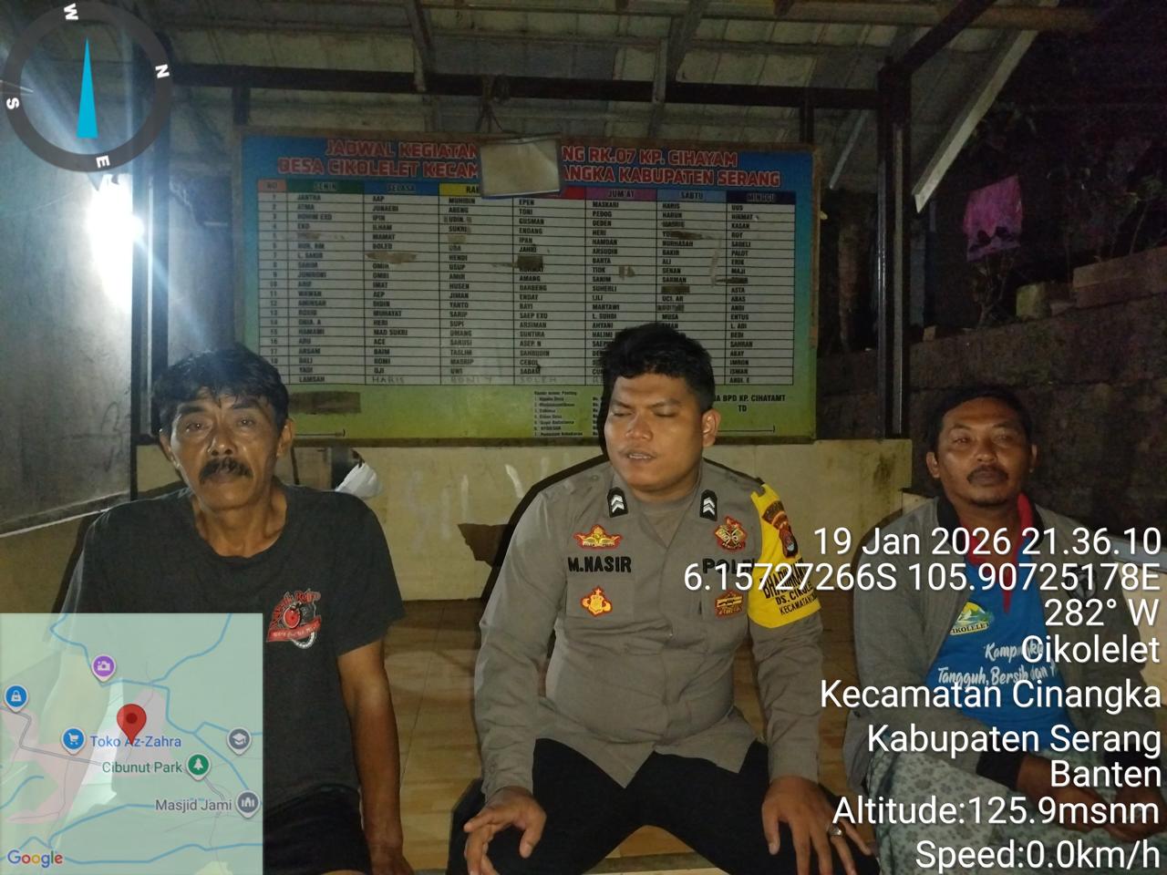 *Polres Cilegon* || Personil Bhabinkamtibmas Polsek Cinangka melaksanakan Program Komandan Wish Kapolda Banten RONDA SATKAMLING menyampaikan komunikasi dengan Petugas Siskamling agar berperan aktif dalam menciptakan Harkamtibmas yang aman dan Kondusif, Selasa (20/01/2026).