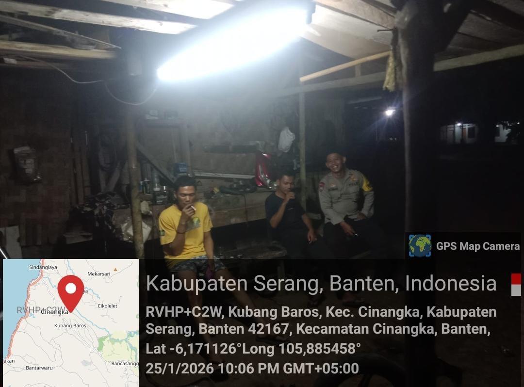 *Polres Cilegon* || Personil Bhabinkamtibmas Polsek Cinangka melaksanakan Program Komandan Wish Kapolda Banten RONDA SATKAMLING menyampaikan komunikasi dengan Petugas Siskamling agar berperan aktif dalam menciptakan Harkamtibmas yang aman dan Kondusif, Senin (26/01/2026).
