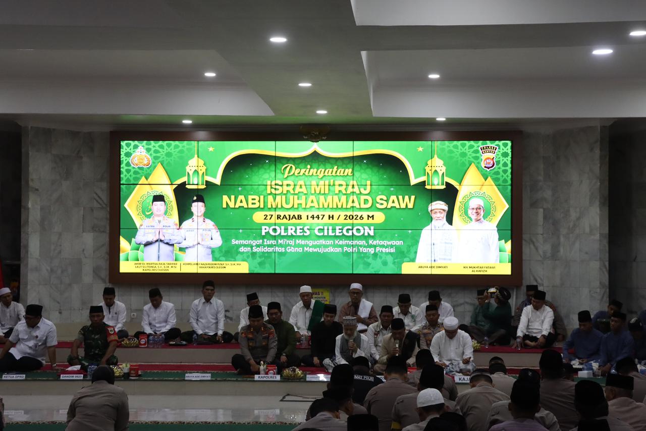 Cilegon – Polres Cilegon menggelar kegiatan istighosah dan ceramah agama dalam rangka Peringatan Hari Besar Islam (PHBI) Isra Mi’raj Nabi Muhammad SAW 1447 H/2026 M, yang berlangsung di Aula Wicaksana Leghawa Polres Cilegon, Rabu, 28/1/2026.