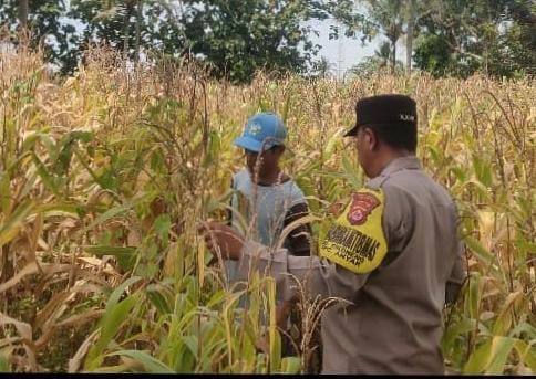 Dalam kegiatan monitoring ini, Bhabinkamtibmas meninjau langsung kondisi lahan jagung.