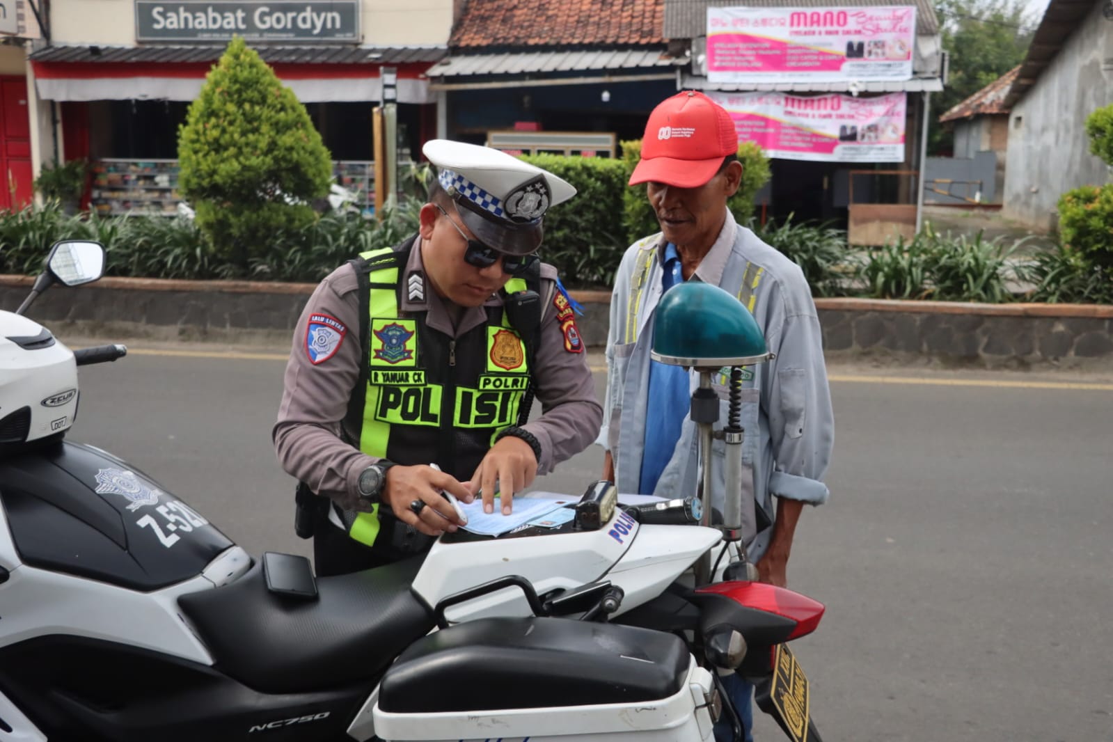 Petugas Sat Lantas Polres Cilegon memberikan edukasi langsung kepada masyarakat terkait pentingnya mematuhi peraturan lalu lintas, menggunakan helm SNI, melengkapi surat-surat kendaraan, serta mengutamakan keselamatan dalam berkendara.