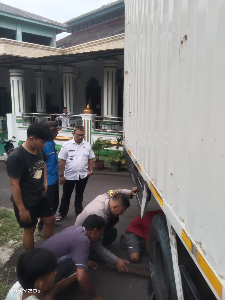 Cilegon - Bhabinkamtibmas Kelurahan Citangkil, AIPDA Warudin, bersama lurah dan linmas, melaksanakan evakuasi mobil box yang terperosok di tengah saluran air di Linkungan Citangkil, RT 03 RW 01, Kelurahan Citangkil, Kecamatan Citangkil, Kota Cilegon. Mobil box yang bermuatan air mineral tersebut berhasil dievakuasi menggunakan dongkrak dan balok kayu, Kamis (26/02/2026).