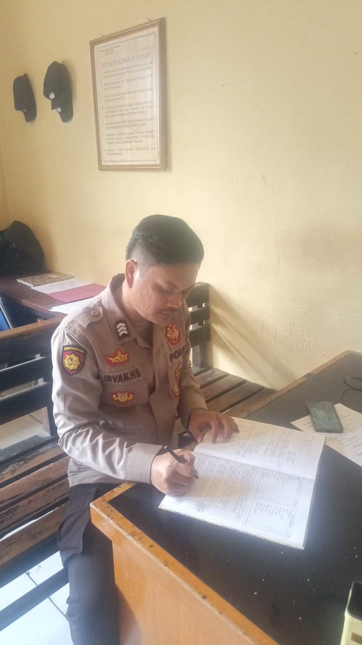 Cilegon, Polres Cilegon Polda Banten. BRIGPOL Irvan anggota Sat Tahti Polres Cilegon Menulis kegiatan di buku mutasi dan kegiatan control tahanan.