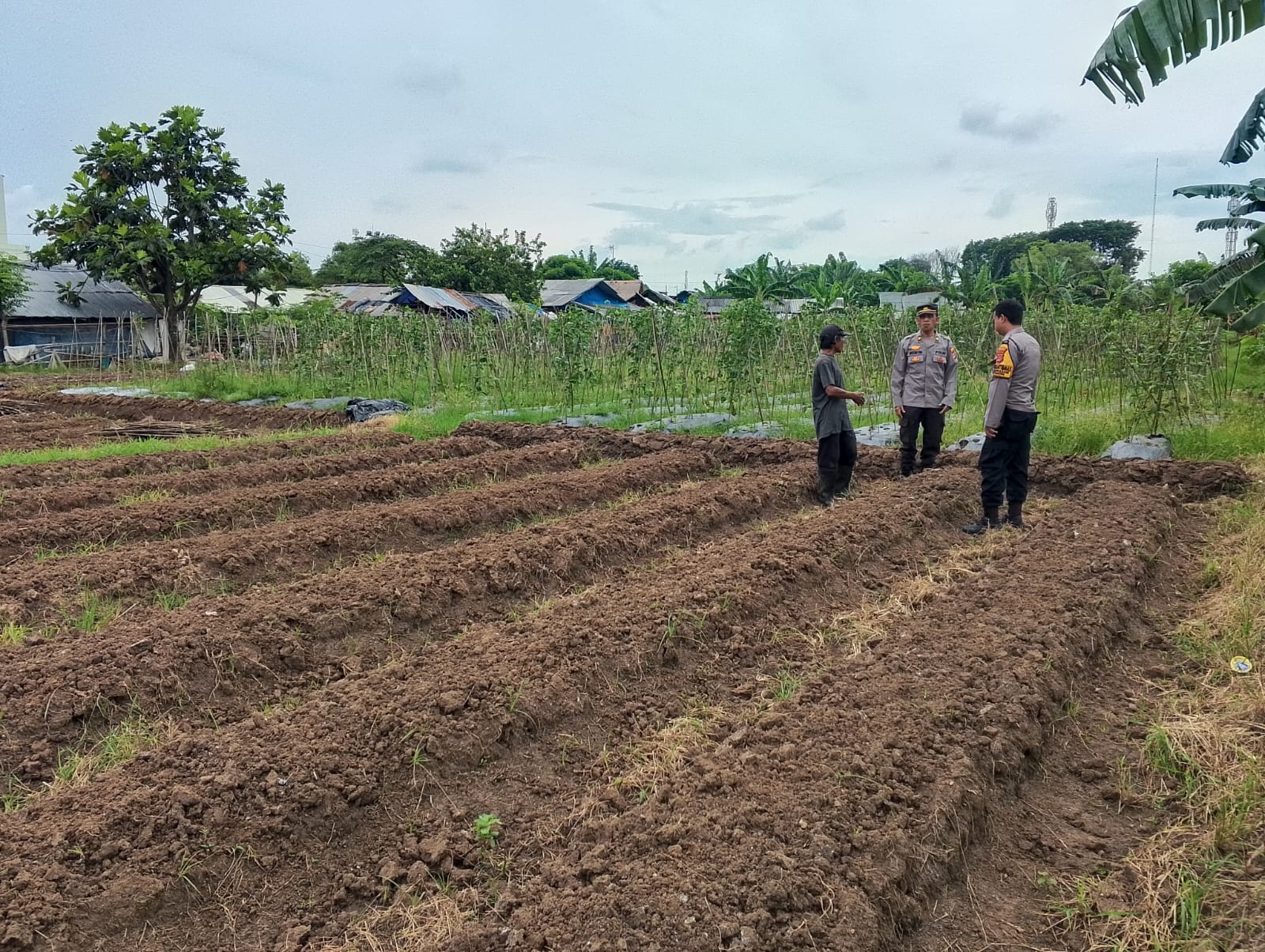 Cilegon - Dalam upaya mendukung program ketahanan pangan nasional Panit Binmas Polsek Ciwandan IPTU Mustriatno Bersama Bhabinkamtibmas Polsek Ciwandan Polres Cilegon Polda Banten AIPDA Mere Erlansyah melaksanakan kegiatan sambang dan kunjungan ke Lahan Produktif warga di lingkungan Kelurahan Warnasari kecamatan Citqngkil kota Cilegon, Senin (02/03/2026).