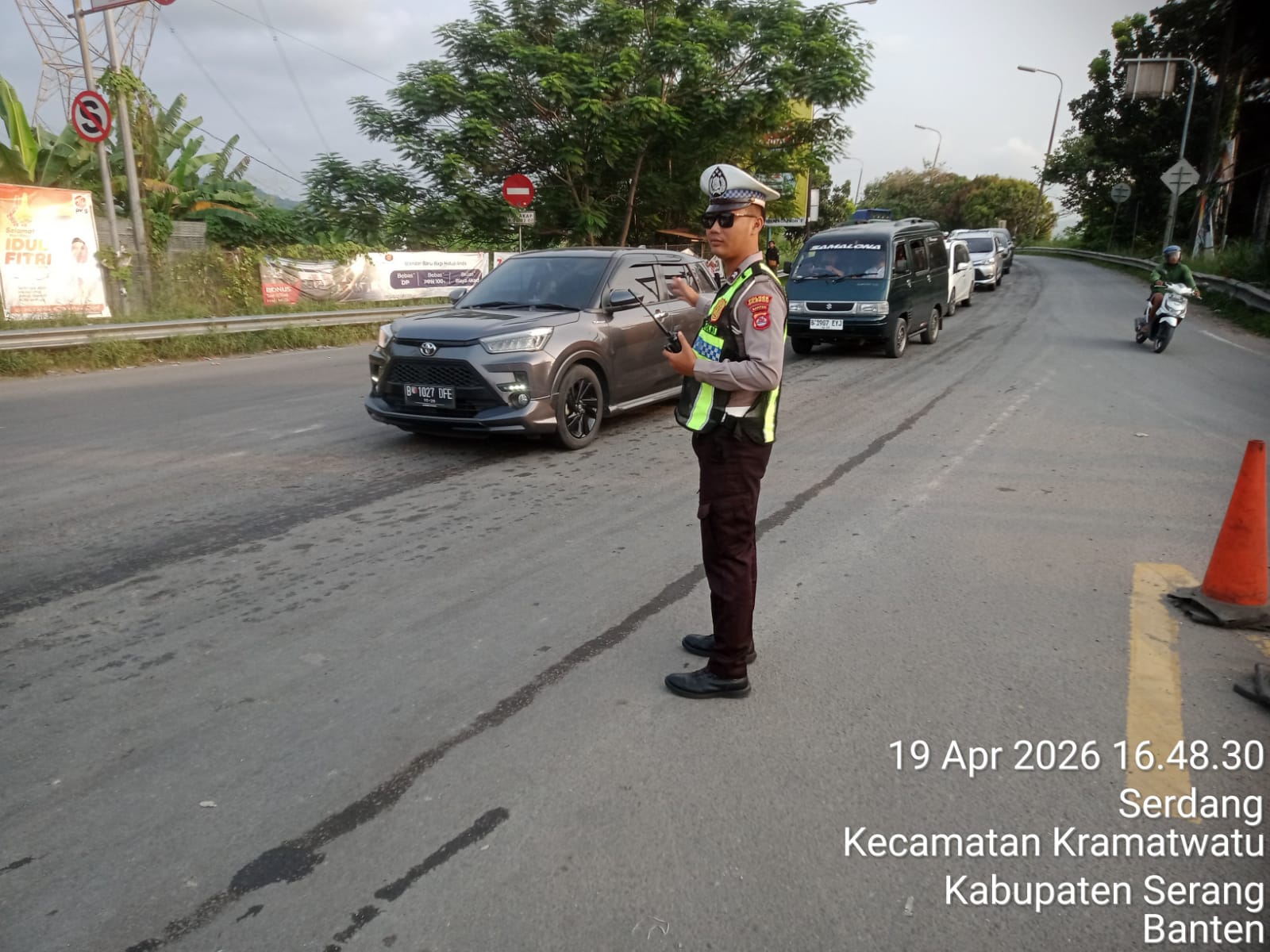 Cilegon, Satlantas Polres Cilegon Polda Banten – Berikan pelayanan kepada masyarakat Kasat lantas Polres Cilegon AKP Ridwan memerintahkan jajaran lalulintas untuk melaksanakan pengaturan lalu lintas di penggal – penggal jalan yang rawan kemacetan di Kota Cilegon, (Minggu,19/4/2026)