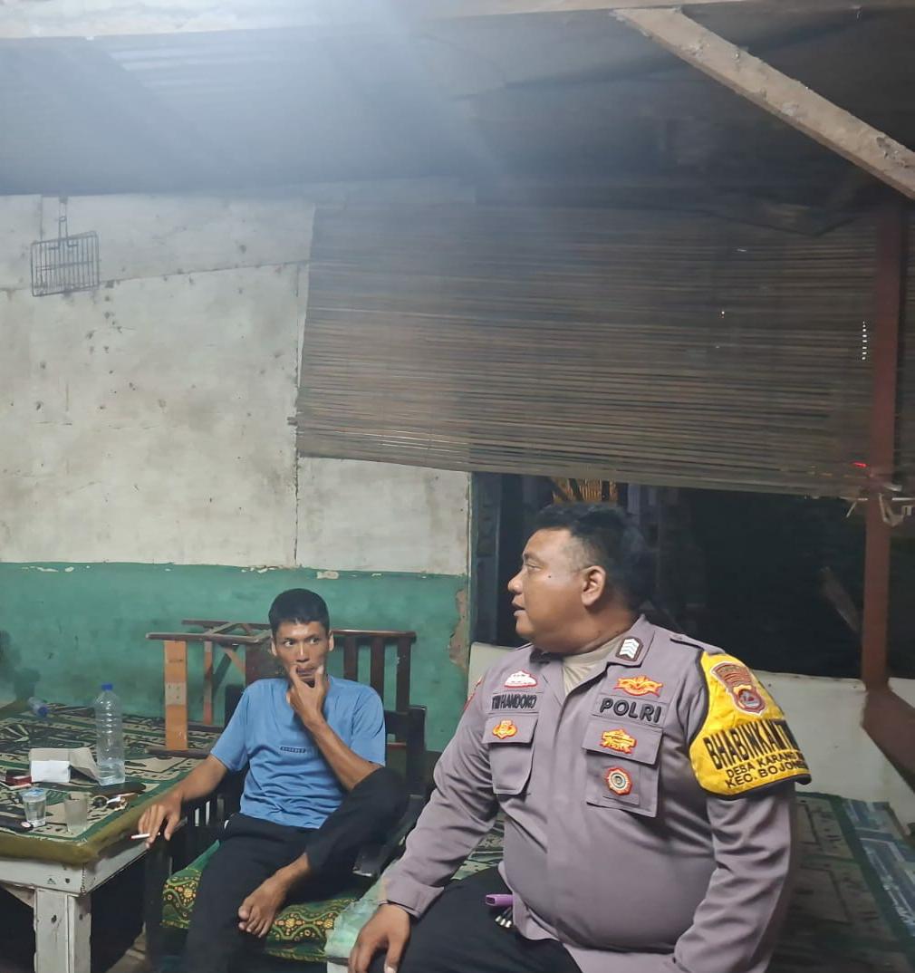 Jaga Desa Binaan Tetap Aman,Bripka Tri Handoko Bhabinkamtibmas Laksanakan Patroli Dialogis dengan warga yang lagi kumpul di desa Binaan