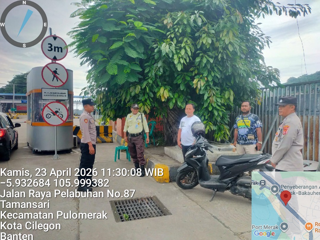 Cilegon - Personel Polsek Kskp Merak Polres Cilegon Polda Banten melaksanakan sambang dan patroli kawasan pelabuhan merak dalam rangka menjaga Harkamtibmas di Kawasan Pelabuhan Merak, Kamis (23/04/2026).