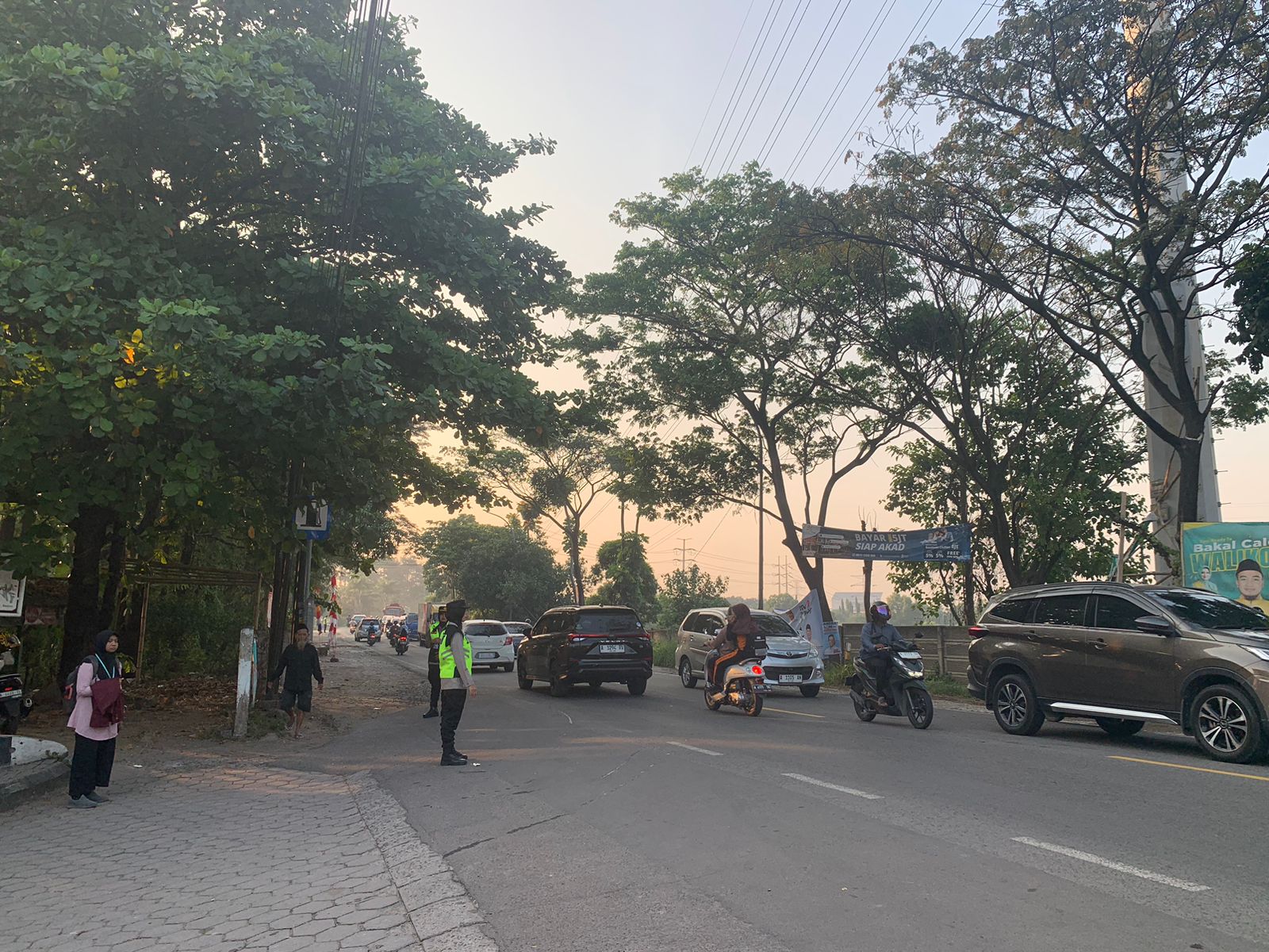 Cilegon,Polres Cilegon Polda Banten Pada Senin/06/10/2025 Pukul 06.30 Wib, Personil Siwas Polres Cilegon, Aipda Emi Prasetyo melaksanakan kegiatan pengaturan arus lalu lintas di Jalur Protokol jalan utama Kota Cilegon tepat nya di jalur depan perumahan arga baja Pura Kota Cilegon.
