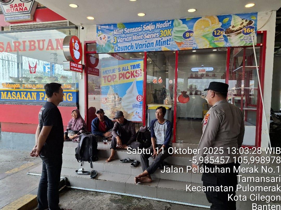 Cilegon - Personel Polsek Kskp Merak Polres Cilegon Polda Banten melaksanakan sambang dan patroli kawasan pelabuhan merak dalam rangka menjaga Harkamtibmas di Kawasan Pelabuhan Merak, Sabtu (11/10/2025).