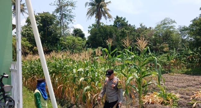 Babinkamtibmas yang bertugas di Kelurahan Kebon Dalam, wilayah hukum Polres Cilegon, menunjukkan kepeduliannya dengan membantu warga melakukan panen jagung