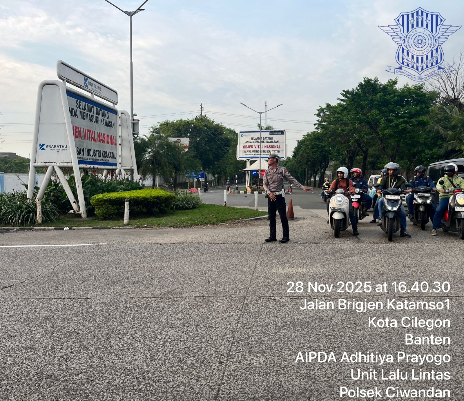 Cilegon - Guna Kelancaran Lalu-lintas Personil Unit Lantas Polsek Ciwandan Polres Cilegon Polda Banten melaksanakan pengaturan lalu-lintas di Simpang Beringin Ciwandan Pertigaan Kawasan Industri KSP/ KIEC I kelurahan Warnasari Kecamatan Citangkil Kota Cilegon, Minggu (30/11/2025).