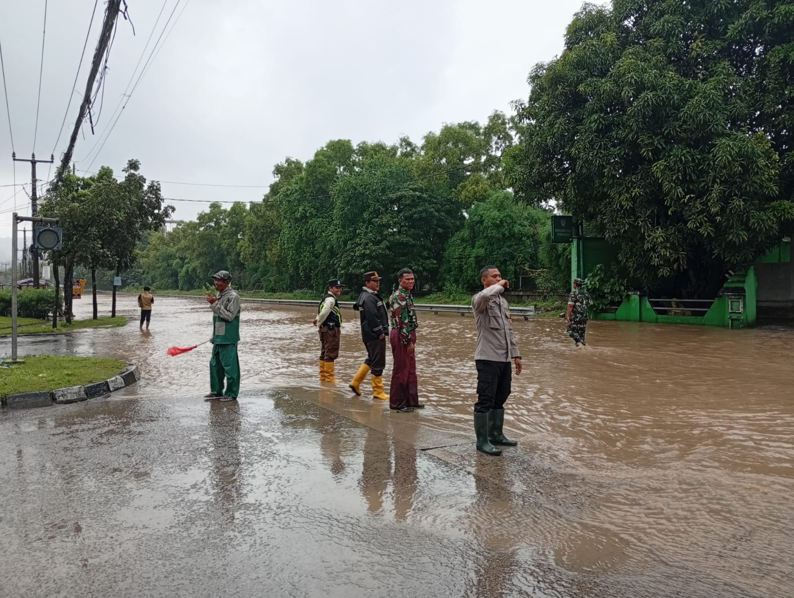 Personil Polsek Ciwandan Alihkan Arus Lalu-Lintas Saat Banjir