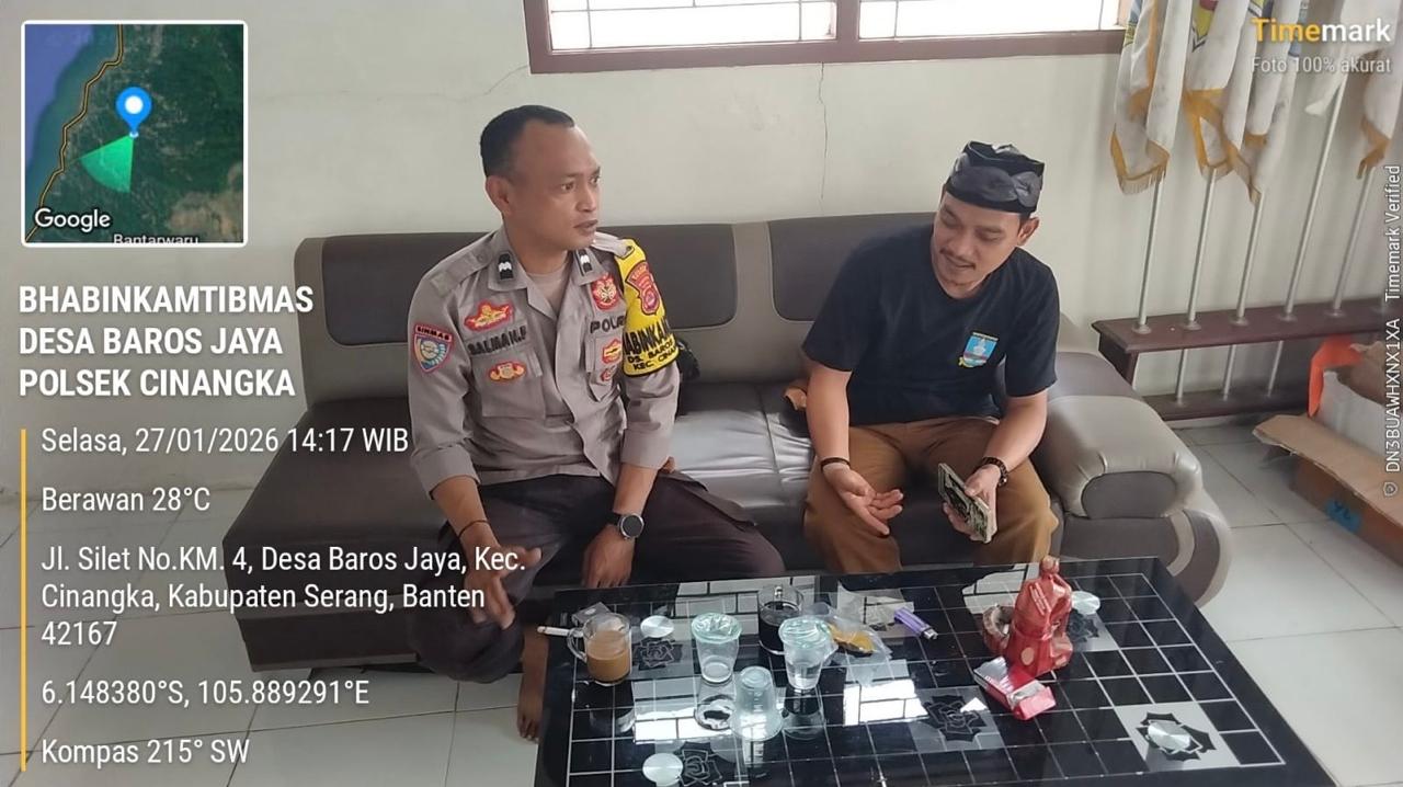 *CILEGON* dalam Rangka Mengantisipasi Gktm di wilayah Personil Bhabinkamtibmas Cinangka melakukan patroli Dialogis dengan Kepala Desa dan warga dan Menanyakan situasi Kamtibmas di wilayah dalam Rangka Menjaga Harkamtibmas di Desa Binaannya Kecamatan Cinangka Kab. Serang. Selasa (26/01/2026).