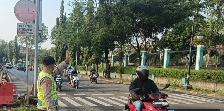 Dalam kondisi pagi hari yang biasanya mengalami kepadatan kendaraan, petugas polisi yang ditempatkan di lokasi bekerja secara terkoordinasi untuk mengarahkan arus lalu lintas, mencegah kemacetan, serta memastikan keamanan setiap pengguna jalan. Langkah ini menjadi bagian dari upaya rutin kepolisian dalam menjaga kelancaran lalu lintas dan keselamatan masyarakat.