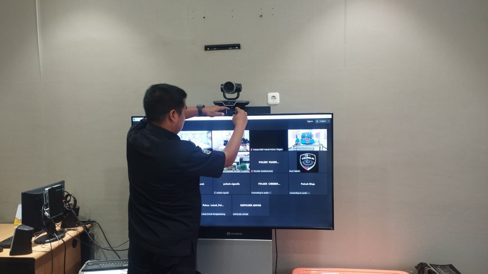 Anggota Tik Polres Cilegon Menyiapkan Sarana dan Prasarana Untuk Kegiatan Zoom meeting Dalam pelaksanaan kegiatan zoom meeting tersebut anggota TIK Polres Cilegon yang bertanggung jawab untuk menyiapkan peralatan zoom. Selain itu agar di tidak ada gangguan jaringan sebelum pelaksanaan anggota TIK melakukan pemeriksaan terhadap sarana dan prasarana tersebut . Satu jam sebelum kegiatan zoom meeting itu dimulai. Kapolres Cilegon AKBP. DR. MARTUA RAJA TARIPAR LAUT SILITONGA. melalui Kasi TIK IPTU Jajang Rohendi menyampaikan bahwa “untuk menunjang kelancaran penyampaian informasi anggota TIk Polres Cilegon selalu memeriksa sarana dan prasarana tersebut, sebelum maupun pada saat pelaksanaan akan selalu di monitor”